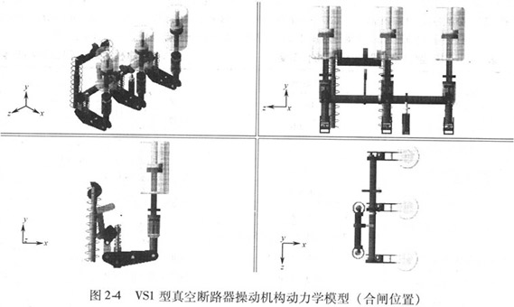 利用ADAMS建立的VS1型真空断路器操动机构动力学模型如图2-4所示,图中左上、右上、左下、右下分别为轴测图、右视图、正视图和顶视图。图2-5所示为模型的放大图形。